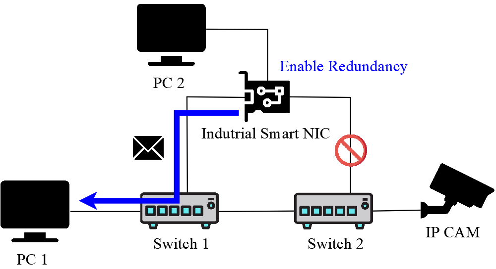 當使用了Industrial Smart NIC的網路環境中,相當於PC2支援使用Redundancy,可以將線路連結在switch 1和switch 2上不怕發生Loop現象,當末端設備PC2跟switch2線路意外斷裂,其他網路設備依舊能收到來自PC2的訊息。